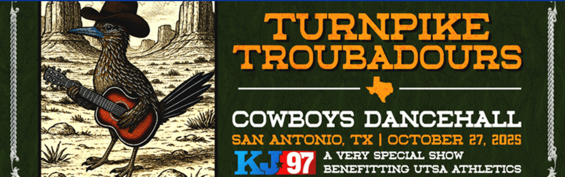 🔼 Low Ticket Alert. A limited number of tickets remain for the Turnpike Troubadours concert on October 27, presented by iHeartMedia San Antonio’s KJ97, to benefit UTSA Athletics. Click here to purchase your tickets today before they are gone.