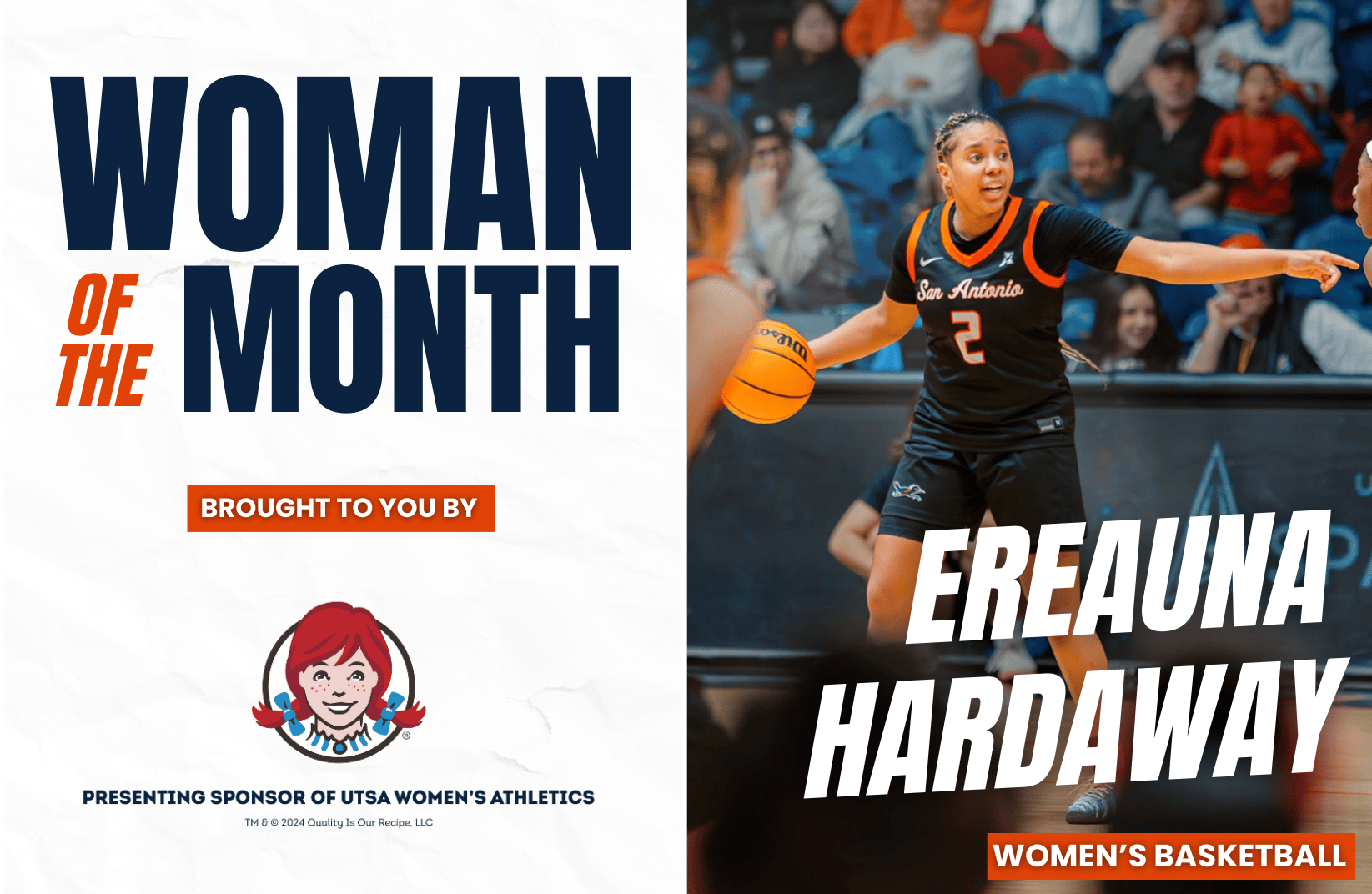 Your Wendy’s Woman of the Month is Women’s Basketball point guard Ereauna Hardaway! In her senior season, Hardaway is averaging 11.1 points, 3.6 rebounds, and 4.9 assists, and has played in 20 games this season.